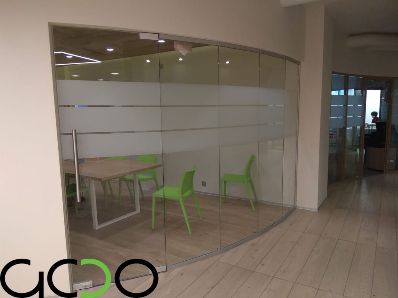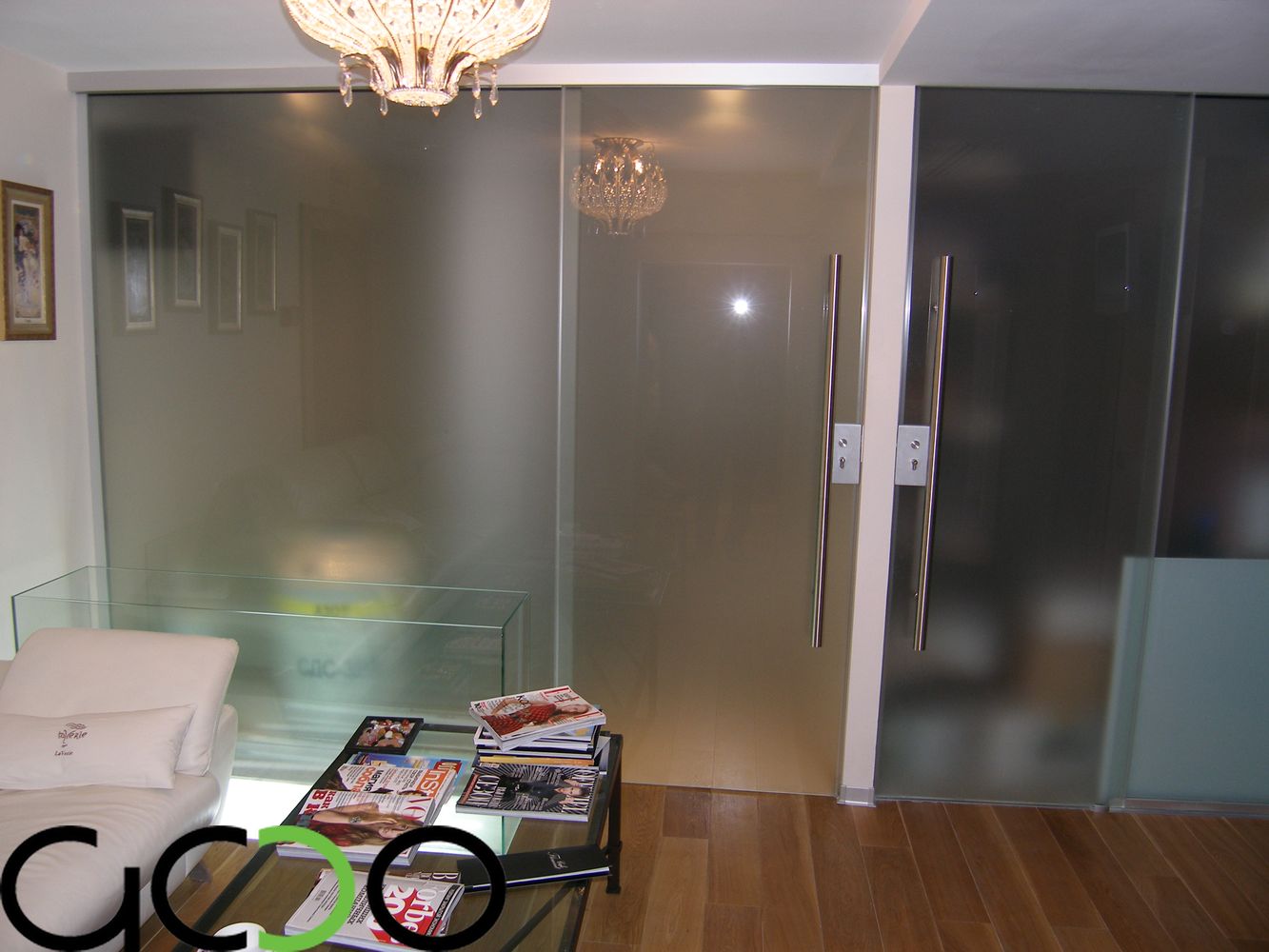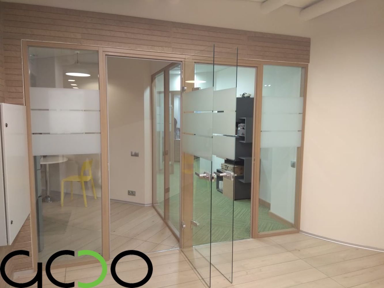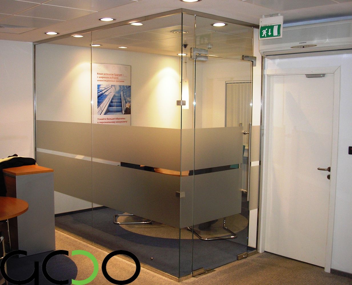 Стеклянные перегородки в свою очередь это--- в своем большинстве перегородки с максимальной площадью остекления ,имеющие в качестве направляющих минимальные по высоте-ширине от 10 до 100 мм профиля либо точечные крепления из нержавеющей стали, а так же фурнитуру для цельностеклянных дверей. Двери в таких перегородках устанавливаются очень часто на нижние доводчики либо «подпятники», позволяющие двери двигаться в маятниковом режиме «вперед-назад», двери в раме комплектуются специальными петлями для них и нажимными ручками-замками .Как ранее мы и говорили –фурнитура и в стеклянных перегородках так же применяется как зарубежных производителей фирмы : USAF, Geze, Dorma, так и отечественных либо лицензированных китайских производителей : «Титан», «Kin Long». В свою очередь как в алюминиевых так и стеклянных перегородках стекло-стеклопакеты заполнения могут быть как полностью прозрачными, так и с непрозрачной или полупрозрачной пленкой различных цветовых оттенков и орнаментов . Стекло может иметь элементы пескоструйной обработки всей площади либо отдельных его участков. Стекло-стеклопакеты могут быть различной структуры: из закаленного стекла различной толщины (как правило от 4 до 15 мм), из стекла-триплекса (от 6 до 16 мм и более), из простого листового стекла от 4 до 10 мм толщиной и более. Стеклянные перегородки в 90 % изготавливаются в размер- в проем с учетом технологических зазоров и привозятся на Объект уже в приготовленном для монтажа виде.