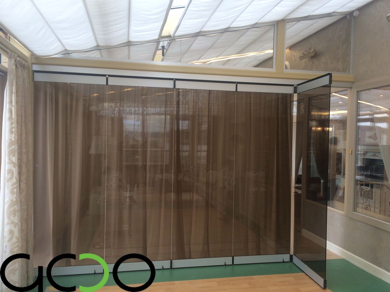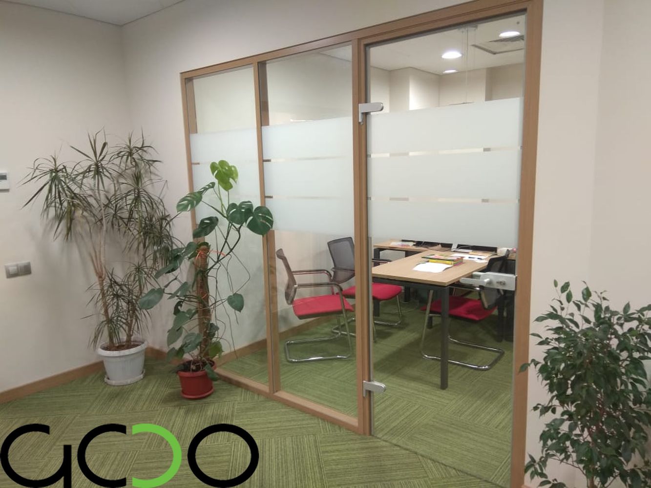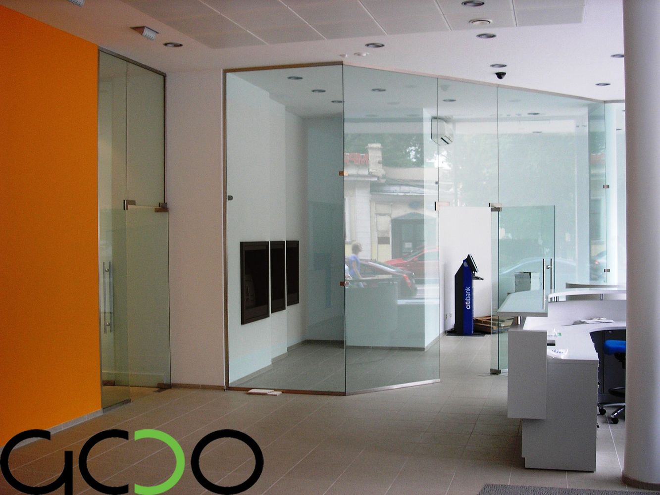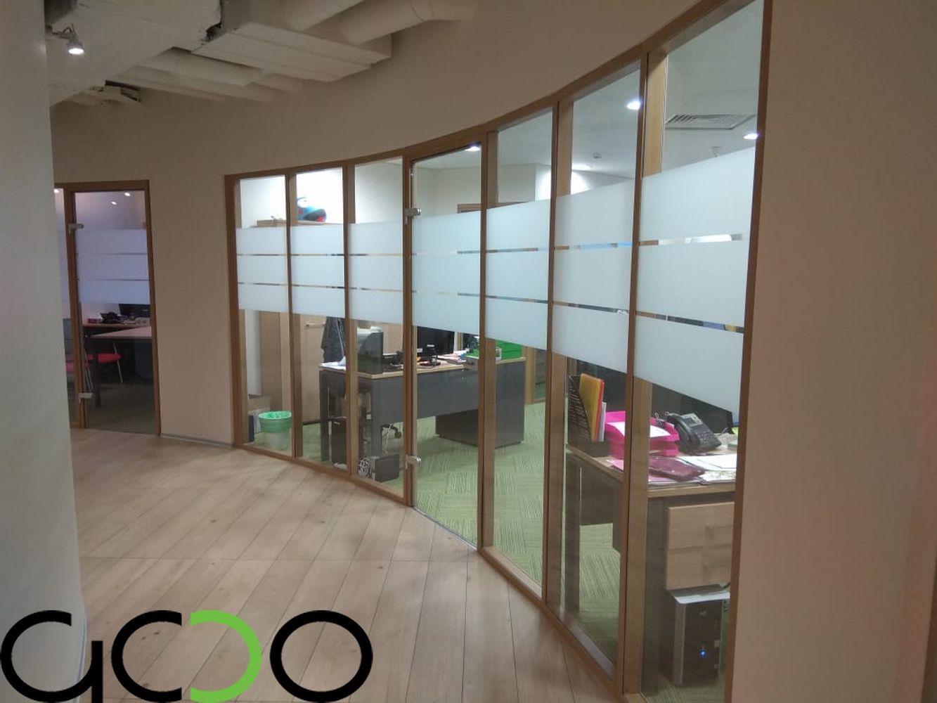 Стеклянные перегородки в свою очередь это--- в своем большинстве перегородки с максимальной площадью остекления ,имеющие в качестве направляющих минимальные по высоте-ширине от 10 до 100 мм профиля либо точечные крепления из нержавеющей стали, а так же фурнитуру для цельностеклянных дверей. Двери в таких перегородках устанавливаются очень часто на нижние доводчики либо «подпятники», позволяющие двери двигаться в маятниковом режиме «вперед-назад», двери в раме комплектуются специальными петлями для них и нажимными ручками-замками .Как ранее мы и говорили –фурнитура и в стеклянных перегородках так же применяется как зарубежных производителей фирмы : USAF, Geze, Dorma, так и отечественных либо лицензированных китайских производителей : «Титан», «Kin Long». В свою очередь как в алюминиевых так и стеклянных перегородках стекло-стеклопакеты заполнения могут быть как полностью прозрачными, так и с непрозрачной или полупрозрачной пленкой различных цветовых оттенков и орнаментов . Стекло может иметь элементы пескоструйной обработки всей площади либо отдельных его участков. Стекло-стеклопакеты могут быть различной структуры: из закаленного стекла различной толщины (как правило от 4 до 15 мм), из стекла-триплекса (от 6 до 16 мм и более), из простого листового стекла от 4 до 10 мм толщиной и более. Стеклянные перегородки в 90 % изготавливаются в размер- в проем с учетом технологических зазоров и привозятся на Объект уже в приготовленном для монтажа виде.